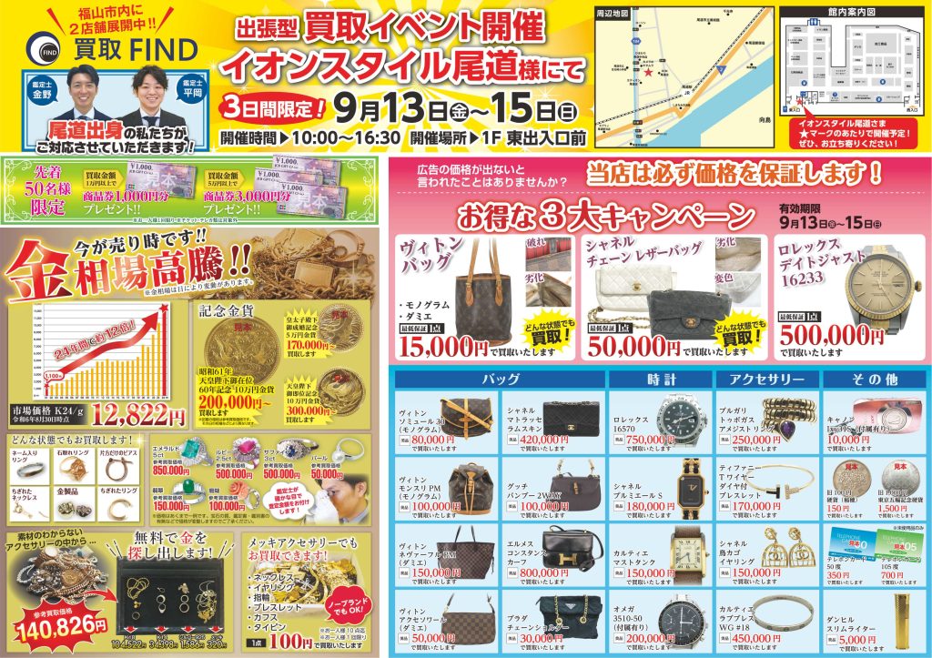 また、今回ご対応させていただく鑑定士はいずれも尾道出身で、開催場所にもゆかりのあるスタッフとなっておりますので、お気軽に・安心してご来店いただければと思います!