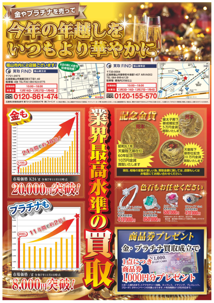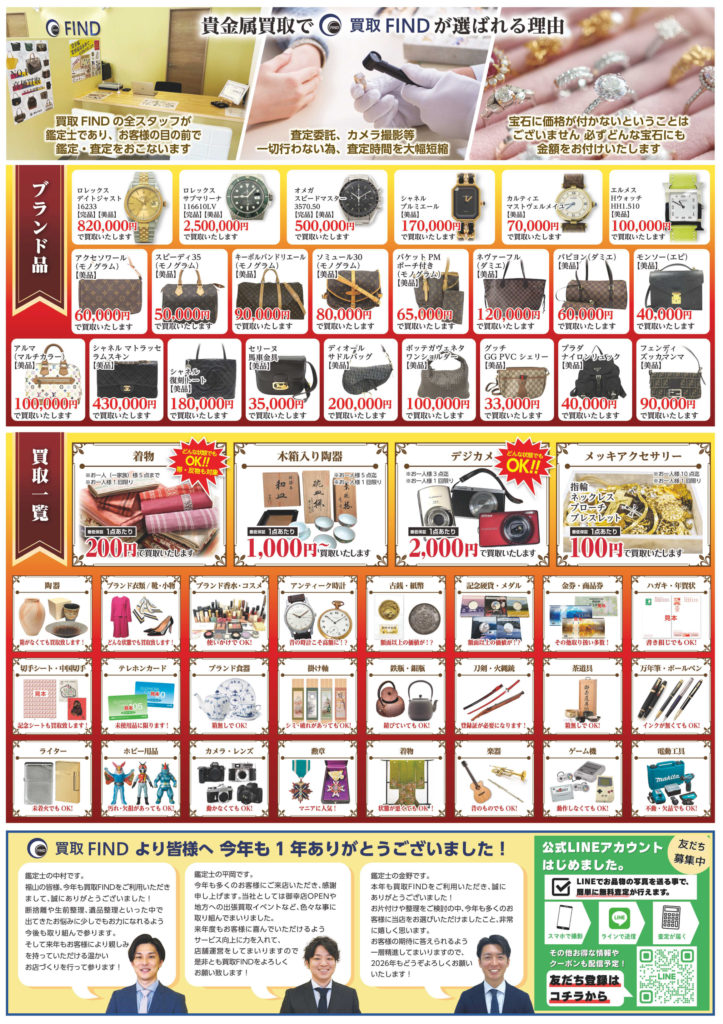 さて12月ですが、買取FINDでは「今年の年越しをいつもより華やかに」というテーマで、皆様の年末年始を少しでも彩ることができるようなお手伝いができればと思っております。